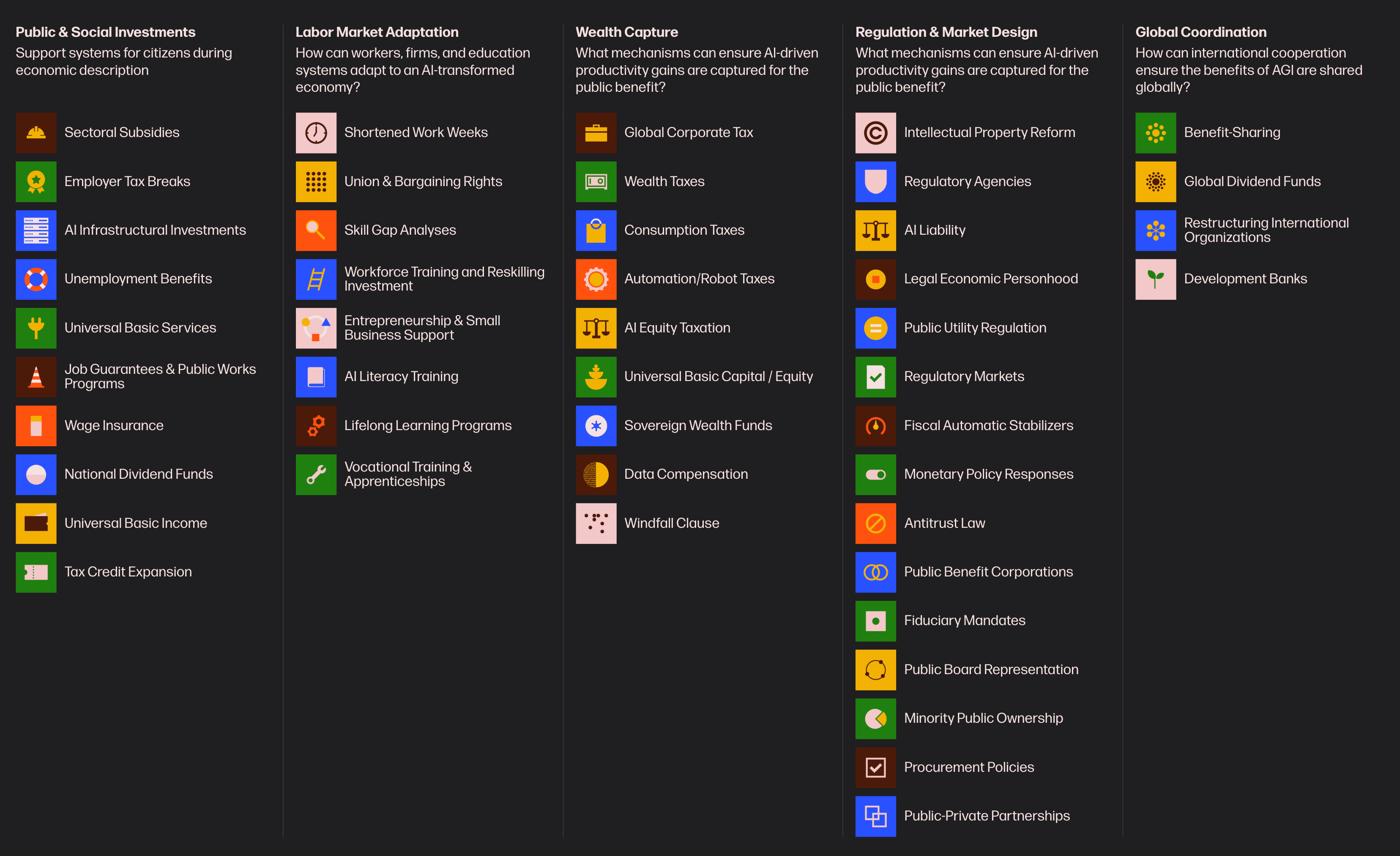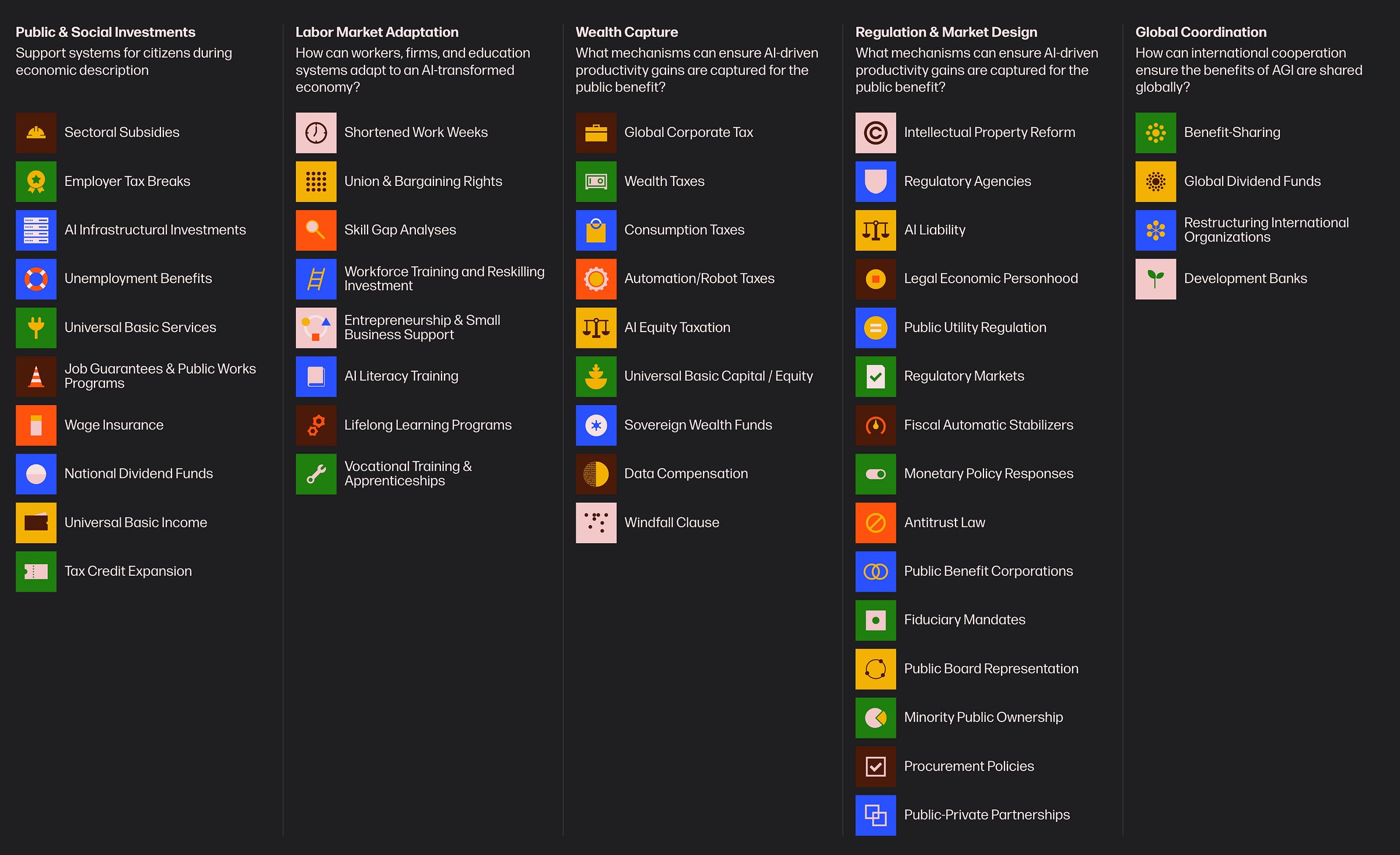 That’s why we are launching the Windfall Policy Atlas: a structured collection of policy proposals designed to support a more serious and coordinated conversation about how to respond to AI-driven economic change. The Atlas spans policies responding to a wide range of issues — from near-term shocks and job displacement, to the potential long-term structural disempowerment of human labor.